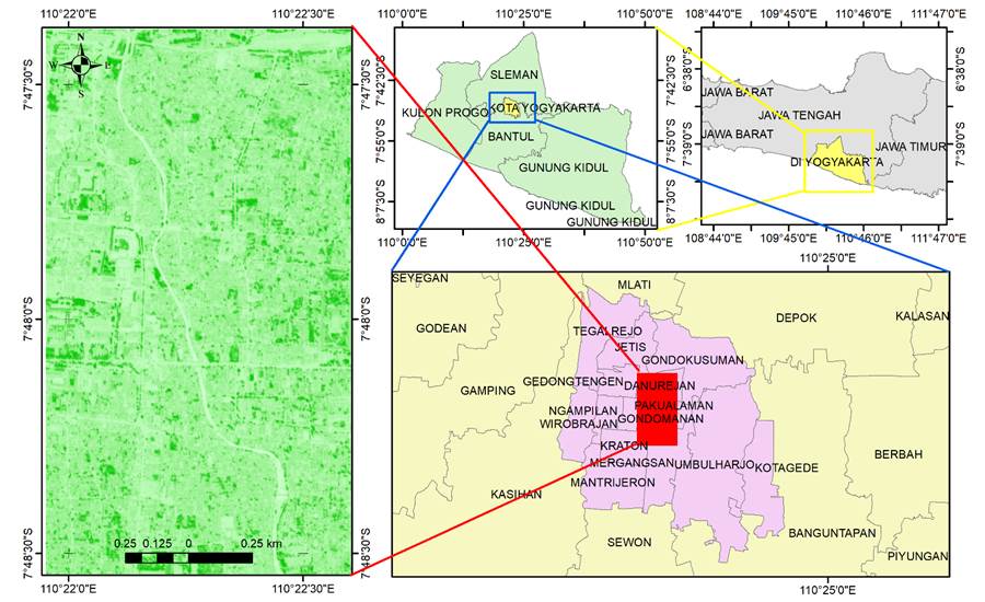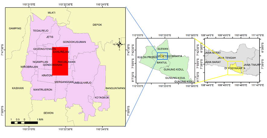 This research was located in a part of Yogyakarta City where slums were not handled (Figure 1). Yogyakarta City, positioned as the Special Region of Yogyakarta (DIY) capital in Indonesia, boasts a significant socio-economic significance. Positioned centrally within the region, Sleman Regency borders it to the north, Bantul Regency and Sleman Regency to the east, Bantul Regency to the south, and Bantul Regency and Sleman Regency to the west. The city's administrative expanse spans 32.5km², constituting around 1.025% of DIY's total area. Its landscape is relatively even from west to east, featuring a slight north-south gradient of approximately 1 degree. Yogyakarta City encompasses 14 districts, where Umbulharjo stands as the largest in both land area (8.12km²) and population (90,775), juxtaposed with Pakualaman as the smallest district in terms of both land area (0.63km²) and population (9,341). The city is uniquely marked by the presence of three rivers coursing through its terrain, intricately interwoven with residential settlements: the Gajah Wong River to the east, Code River in the central area, and the Winongo River to the west (Yogyakarta, 2020).