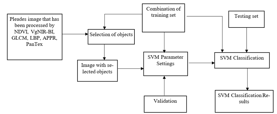 Leveraging the Pleiades satellite imagery, an advanced Support Vector Machine (SVM) technique has been methodically developed to identify and delineate slum areas within intricate urban landscapes (Figure 2). The methodology kicks off with an exhaustive preprocessing of the Pleiades image. In this phase, the Normalized Difference Vegetation Index (NDVI) is applied as a pivotal metric to gauge the health of vegetation, singling out zones of active photosynthesis. Complementing this, the Visible Green-Near Infrared Band Index (VgNIR-BI), operating within specific bands of the visible green and near-infrared spectrum, offers further granularity to vegetation and other specific feature data. The Gray Level Co-occurrence Matrix (GLCM) and the Local Binary Pattern (LBP) are incorporated to unearth the spatial nuances and textures inherent in the urban tapestry. The GLCM fetches intricate patterns by assessing the relationships between pixel values, while the LBP provides a binary representation of local textures based on neighboring pixel juxtapositions. The role of Another Pattern Recognition (APPR), albeit not clarified in detail, is likely geared toward enhancing texture or structural interpretation. Meanwhile, the Panoramic Texture (PanTex) index, specifically crafted to discern urban imprints, facilitates the distinction between human-made constructions and untouched natural expanses. This multifaceted preprocessing ambit turns the initial image into a data-rich matrix infused with detailed spatial, textural, and spectral insights.