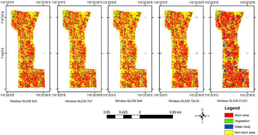 The user defines a movable window and forms a matrix of shared events. The window sizes used in this study are: 5 x 5; 7 x 7; 9 x 9; 15 x 15; and 21 x 21. The GLCM results for each window can be seen in Figure 4. Classification of Pleiades images using Region of Interest for the classification of 4 types, namely: slum (region01), vegetation (region02), body of water (region03), and non-slum built-up land (region04). Based on the accuracy test results, GLCM with windows size 21x21 was obtained, which produced the best accuracy of 86.25%, with a kappa coefficient of 0.796. In detail, the accuracy testing can be seen in Table 5.