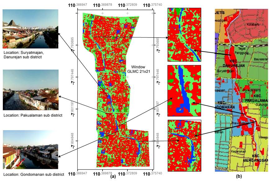 Figure 5. (a) Slum Settlement Identification Results using SVM, (b) Slum Settlement Map Pieces from the KOTAKU Program.
