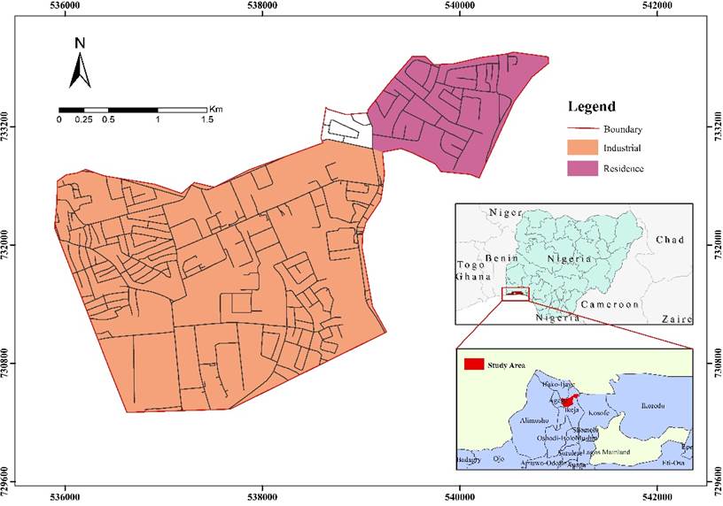 Figure 1. The study area map of Omole Estate Phase 1 and the Industrial area of Ikeja, Lagos, Nigeria (ArcGIS data, 2022).