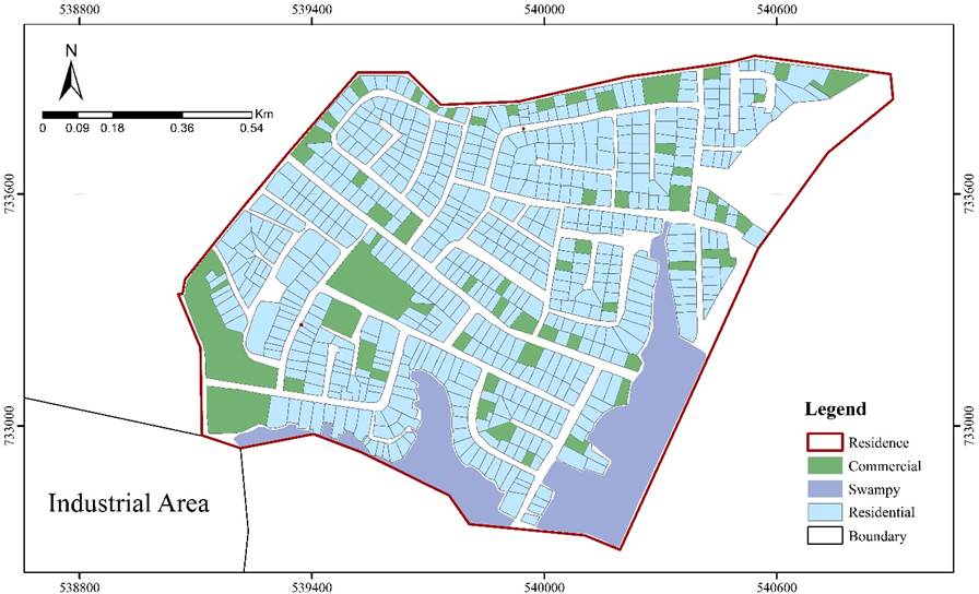 Land use dynamics is critical for managing any area, given that it provides various essential services for people (Ray et al., 2023; Hartling et al., 2021). The land use was produced using ArcGIS 10.6.1. Where the Google Earth image seen in Figure 4 was georeferenced, digitised and updated, the study area was classified into the following, specifically Residential, Commercial and Bare ground.