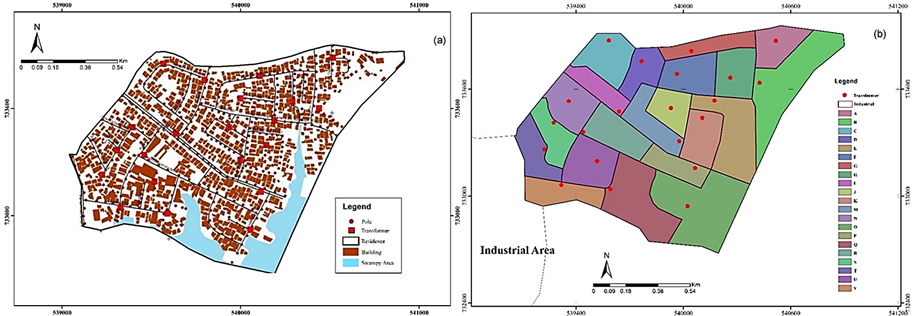 Figure 5. Transformer Distribution (a) Building a footprint on Omole Estate, (b) transformer catchment area in Omole Estate.