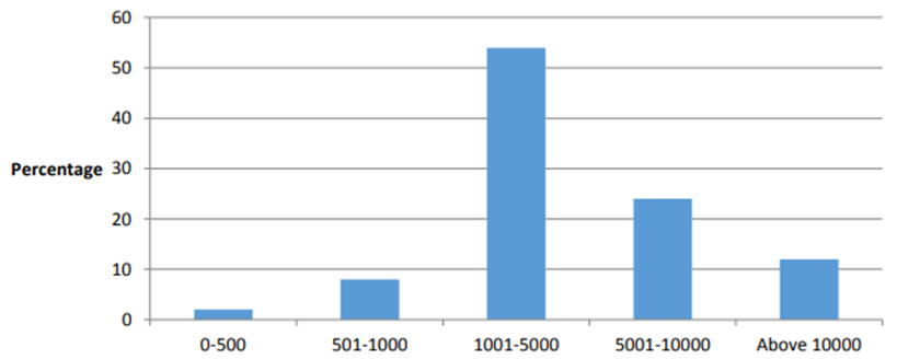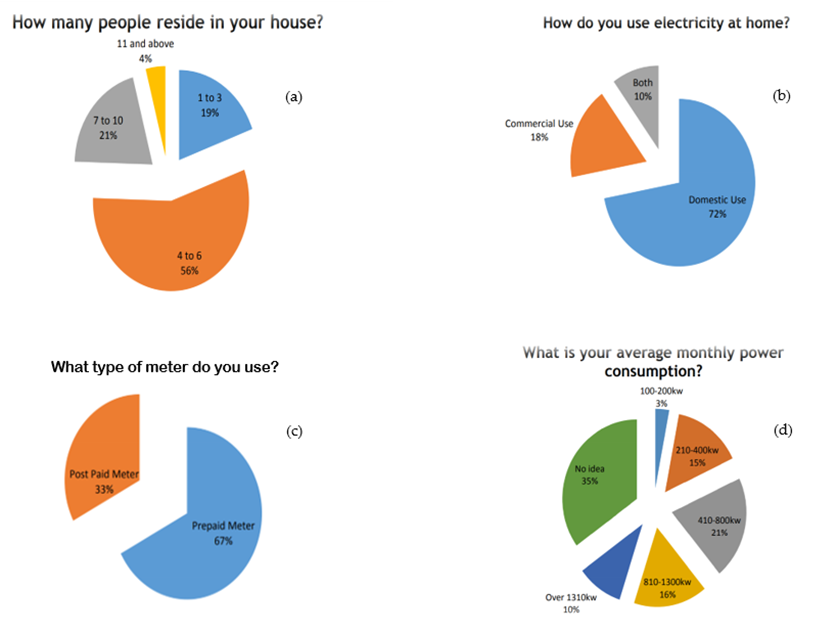 The results of the questionnaires for the residents of Omole Estate were computed statistically and presented in Figure 7, 8, and 9. Figure 7 highlights the different levels of electricity consumption among the residents, while Figure 8 illustrates the corresponding electricity bills. This research serves as a framework for focused initiatives that are meant to encourage sustainable development and energy efficiency in the neighbourhood. It was discovered that 99% of the respondents have an electric meter in their residence while 1% do not have an electric meter in their residence. The composition of the households within the estate is specified in Figure 7a. According to the analysis, 19% of the respondents live in households with 0 to 3 people, 56% reside in households comprising 4 to 6 people, 21% are part of households containing seven to ten people, whilst 11% live in households with 11 or more people. This distribution provides important information regarding household sizes and their accompanying patterns of power consumption. A breakdown of the uses for electricity is shown in Figure 7b. It is notable that 72% of the respondents claimed that they use power primarily for domestic needs, highlighting how commonplace residential consumption is. Meanwhile, 10% of people use power for both household and commercial purposes, whereas 18% use it for business purposes, demonstrating how common electricity use is within society. In Figure 7c, the emphasis is now on meter types (Siddik et al., 2023). Considering the fact that the majority of respondents (67%) use prepaid cards or electrical meters, a sizeable percentage (33%) continue to use the more traditional postpaid meters. Despite the countrywide switch to more sophisticated metering systems, postpaid meters continue to exist, indicating a need for increased awareness about and the utilisation of contemporary technology. An interesting finding involving knowledge of energy consumption can be found by examining Figure 7d. A third or 35% of respondents are unaware of how much energy they use each month or how much each unit costs. This knowledge gap suggests that there may be room for improvement in attempts to conserve energy, principally among consumers who do not regularly track their use. The last section in this analysis considers respondents' typical monthly electricity use. According to the data, 3% of participants use between 100 and 200 kW, 21% use between 210 and 400 kW, 8% use between 410 and 800 kW, 16% use between 810 and 1,310 kW, while 10% use more than 1,310 kW.