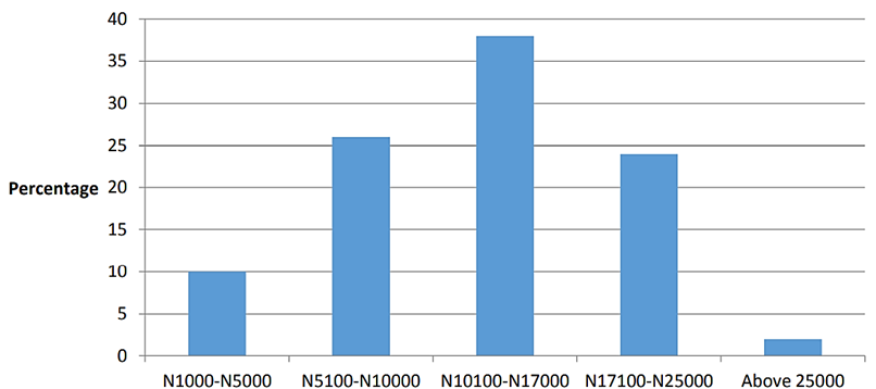 Of those who responded to the study, 10% said that they spend between N1,000 and N5,000 per month on energy. This group of people falls under the category of maintaining a reasonably low monthly expenditure on energy consumption. Regarding 27% of the responses, the next spending range, from N5,000 to N10,000, attracts the most interest. This significant percentage underlines the fact that a sizeable majority of survey respondents place their financial resources within this mid-range spending range, which represents a level of use that is relatively common and cost-effective. The bar graph reveals a rising trend in electricity consumption, with 38% of respondents having monthly incomes between N10,100 and N17,000, indicating a larger portion spending more on power. Concerning the respondents, 24% are in the N17,100 to N25,000 bracket, indicating more demanding households or specific needs, whereas 2% of the respondents reported spending over N25,000 on electricity, signifying high-end use and costs. This information highlights the financial costs associated with power use and provides useful information for utility management, pricing tactics and resource allocation in the context of electricity supply (see Figure 9). The result of the amount spent on running the generator weekly between 3-6 hrs shows that 2% of respondents spend between N0 to N500 per week running their generators, 8% spend between N501 to N1000, 54% spend between N1001 to N5000, 24% spend over N5001-N10000 while 12% spend above N10000.