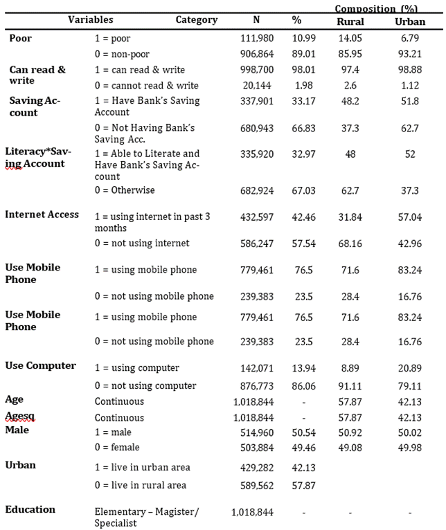 The table above shows the descriptive statistics of each variable. We can see that 10.99% of the sample has an average expenditure below the poverty line, or it categorizes as poor. In addition, the population of poor individual are higher in rural area than in urban area. Furthermore, 98.01% of total sample are already can read and write. From the 1.98% participants who cannot read and write, 76% or 15,333 people out of 1.98% are live in rural area while the rest of them, 24% or 4,811 people, live in urban area. The huge number of illiterates cannot read and write person in rural area indicates the disparityin education both in term of education quality and the coverage of education itself. The high number of non-literates and low adaptation of technology such as internet and gadget, may be one of the reasons why poor population is also higher in rural area.