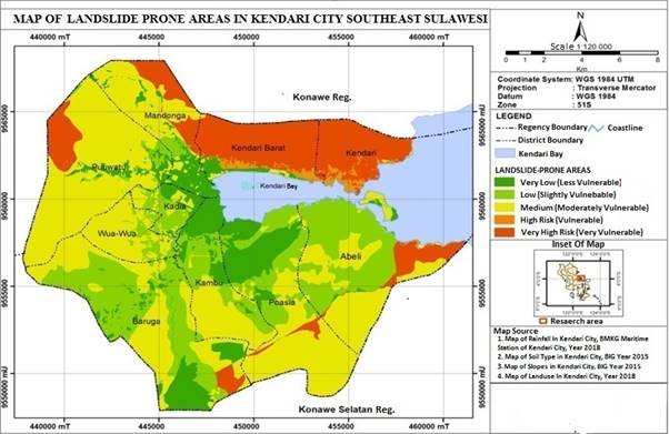 The Regional Disaster Management Agency (BPBD) (2012) landslide zone map shows that landslides on a medium to high scale can occur in almost all of Kendari City, particularly in areas bordering Konawe and South Konawe, and half of the central residential area. However, this 2012 map requires improvement and updating with recent data/information.