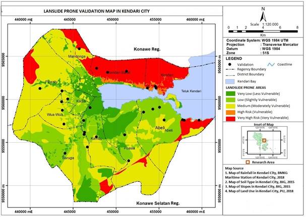 These results reinforce of the results of the mapping of landslide-prone zones in Kendari City, and make the map suitable for publication as a guide in disaster preparedness against landslides. According to Hilman & Sunaedi (2018), a highly accurate landslide map can improve community preparedness and reduce the impact of disasters.