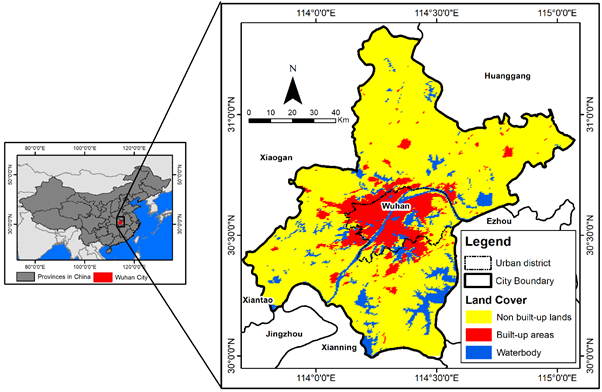 Figure 1. Map of Wuhan City as the study areas represented by generalised MODIS land cover data.