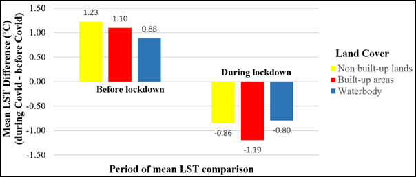 Figure 6 illustrates mean LST differences as the results of mean LST during the COVID-19 period subtracted by mean LST before the emergence of the COVID-19 period for each land cover type, as without and with the implementation of lockdown policy. Overall, the waterbody exhibited the smallest mean LST differences for both before and during the implementation of lockdown policy by 0.88ºC and -0.80ºC, respectively. To be more specific, before lockdown policy was applied, non-built-up lands exhibited the most significant mean LST difference between during COVID-19 and the average of the past three years before the emergence of COVID-19 period, which means that the average LST for non-built-up lands during the emergence of COVID-19 was higher than the average of the past three years before the emergence of COVID-19 period by 1.23 ºC, then followed by built-up areas by 1.10 ºC. Furthermore, during lockdown policy applied, the most significant mean LST difference between during COVID-19 and the average of the past three years before the emergence of the COVID-19 period was observed in built-up areas by -1.19 ºC and followed by non-built-up lands by -0.86 ºC. In other words, during lockdown condition, mean LST during the COVID-19 period was below the average of the past three years on the same dates by 1.19 ºC and 0.86 ºC for built-up and non-built-up lands, respectively.