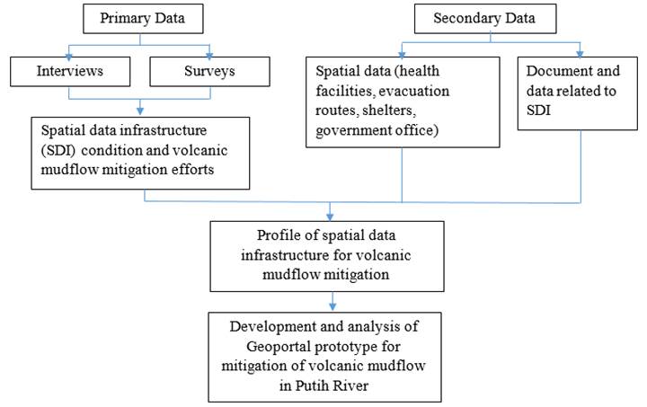 There were three stages of data collection in the study. The first involved interviewing officials or agencies of the local government institutions of Magelang Regency to obtain information about volcanic mudflow mitigation efforts in Kali Putih, Magelang Regency. The local institutions related to disaster mitigation are the Regional Disaster Management Agency (BPBD), Planning Agency (Bappeda), Public Works, Settlement and Housing Agency (Dinas PUPR Perkim), Balai Sabo, Health Agency and Agency for Investigation and Development of Geological Disaster Technology (BPPTKG). The second stage was the collection of secondary data in the form of reports and documents related to SDI, together with spatial data availability related to volcanic mudflow mitigation. The final stage was to build a geoportal prototype to share information related to the volcanic mudflow mitigation efforts.