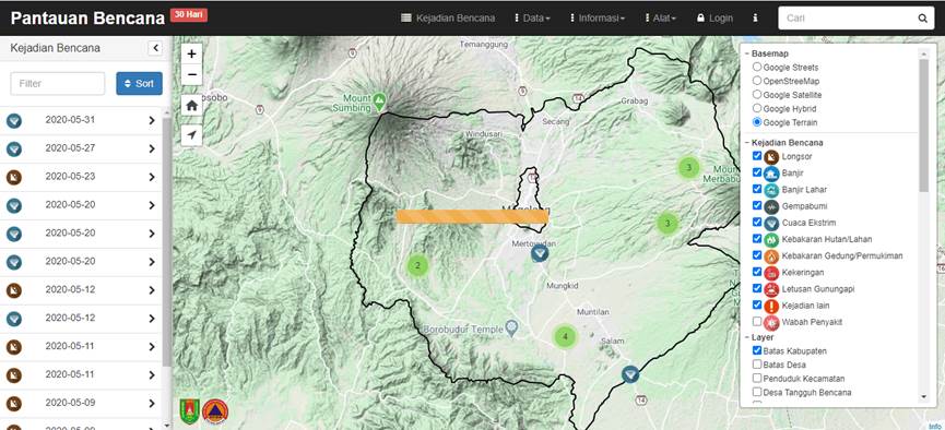 Hardware infrastructure such as servers and computers and software are available, but data accessibility for the public is still minimal and it does not include volcanic mudflow hazards specifically. The only disaster spatial data produced by BPBD that can be accessed publicly are on the website http://sikk.bpbdmagelang.id/. Figure 2 shows that the portal is mainly related to general disaster hazards in Magelang Regency.
