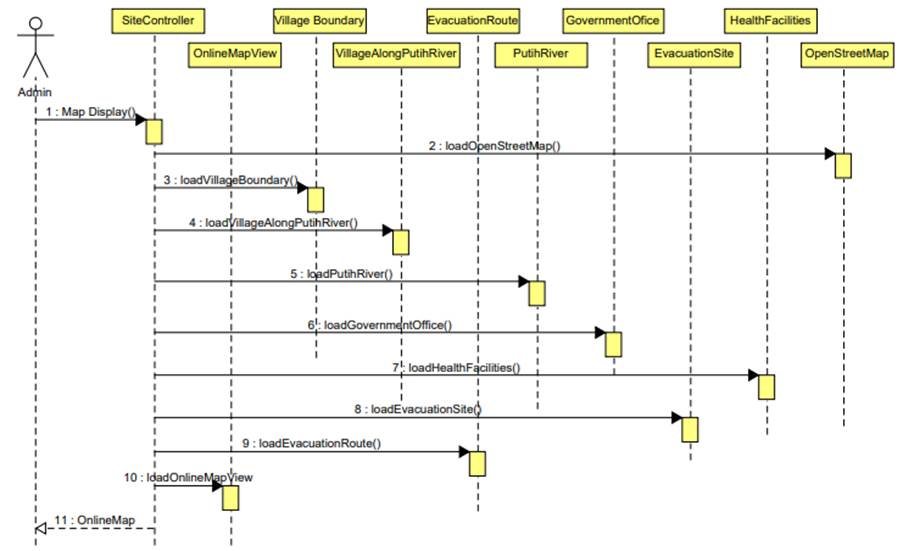 The Spatial Data Infrastructure (SDI) design as a volcanic mudflow mitigation platform was built using an open source platform, a basemap from OpenStreet Map and library from LeafletJS. The geoportal system workflow and the way entities in the system interact, begin when the user logs in. Logging onto the system will call up OpenStreetmap along with thematic data, namely evacuation routes, Putih River, shelter locations, evacuation routes, health facilities and government offices. The user can then access the map online together with the features available on the system. The system workflow is shown as a sequence diagram in Figure 3.