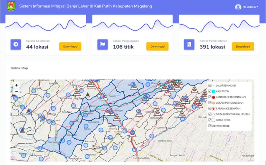 The volcanic mudflow mitigation geoportal in Putih River, Magelang Regency is a user friendly front-end containing header, titles, legends, navigation (zoom in, zoom out), information of attributes and downloadable spatial data. The data included in the system are shelter locations, health facility locations, government office locations, and evacuation routes. Each location is connected to an evacuation route, making it easier for users to understand the evacuation process and nearest health facilities, government office or shelter. In the SDI context, spatial data and information can be used for sharing and conducting other analysis. Geoportals are able to provide users, the community and local government with access to download the data and conduct such analysis. Figure 4 shows the main view of the system.