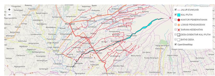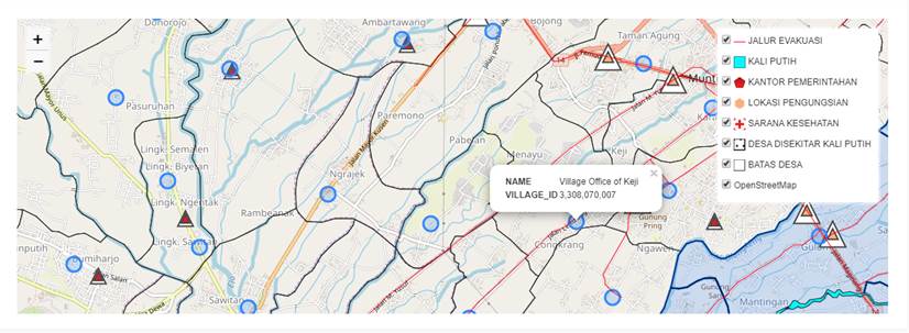 All data attribute information can be identified with one click on the data icon. This identification feature allows users to understand the information contained in the data. With the available features, the system can be easily used and it provides sufficient information related to the location that must be addressed when a volcanic mudflow disaster occurs. Figure 5 shows the identification features of the system, which also has a map legend to suit user needs. Users can activate and deactivate one or more items in the legend, such as evacuation routes or evacuation points, so that what is seen on the system can be adjusted. Figure 6 shows the map content in the system through a map legend.