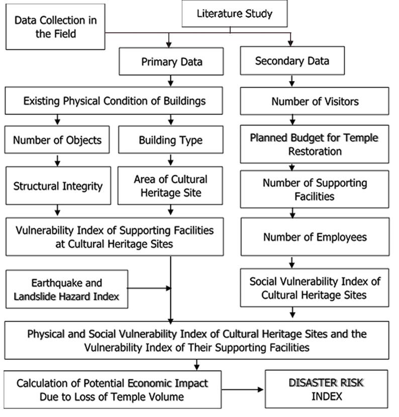 The variables used to assess the vulnerability and risk of cultural heritage include the type of building structure, the quality of material used, building network and flexibility, type of structural irregularity, and ease of retrofit (Parisi & Augenti, 2013). Another opinion states that these disaster aspects are measurable from stakeholder involvement, the understanding of term use, and the economic valuation of cultural heritage (Marchezini et al., 2020). Apart from the diversity of vulnerability and risk variables, the availability of hazard data is also necessary because they act as the primary input to various scenarios (Wang, 2015). The availability of variables in Indonesia certainly has its uniqueness, as represented by existing data access.
