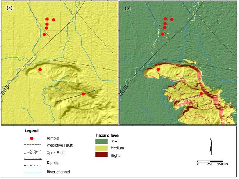 The research started with identifying temples exposed to earthquake hazards and their secondary effects, such as landslides, in Yogyakarta. At least seven temples fulfill this category, namely Sewu, Bubrah, Lumbung, Ghana, Ratu Boko Site, Prambanan, and Ijo. These temples were selected by taking their geomorphological positions into account and, thus, can be differentiated into two units: temples in alluvial plans and temples on structural hills. Alluvial plains have loose constituent materials, allowing vibration to propagate more intensively than structural hills that are composed of dense and compact materials. Accordingly, temples located in the former are more exposed to earthquakes compared to the ones on the latter. Structural hills, however, are susceptible to landslides or mass movements, which can also take place as the secondary effects of earthquakes (see Figure 2).