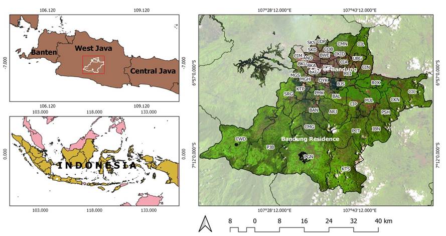 Figure 1. Study location for the distribution of COVID-19 in the Bandung region overlayed with a false-color composite of Landsat data image. The color represents different land-use (left figure) where green, brown, dark blue indicate the vegetated area, settlement and water, respectively.