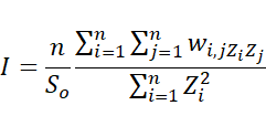 The formula is utilized for global Moran's I computation which requires w, So, and Zi, where Zj as weights, deviations from the mean, and the sums of all weights at row standardized weights, respectively (Geoda, 2020). This parameter is shown in the formula (Eq. 2). All the variables used for LISA in Eq. 2 is explained in the formula below (Eq. 3-7). At the time, the values of Moran's I is already well-known and has positive values to indicate the similarities of the high or low attribute values from the neighboring features. These conditions are used as the basis for the clustering, as well as when a negative value is obtained (ArcGIS, 2020).