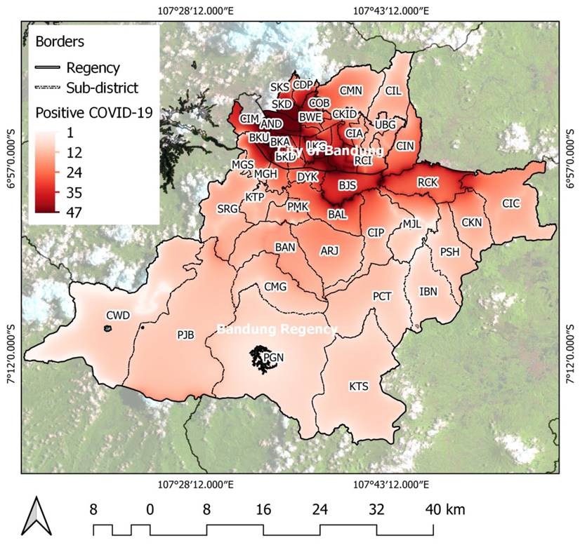 There are two types of data used in this study. The first is the tabular data which consists of the confirmed case of COVID-19 positive patients and population data in two locations up to sub-district and village levels. Data of the confirmed positive for COVID-19 was obtained for free from the West Java Government official website (https://pikobar.jabarprov.go.id/) accessed on September 25th 2020. It shows the historical data from the early cases of COVID-19 in Bandung Region.