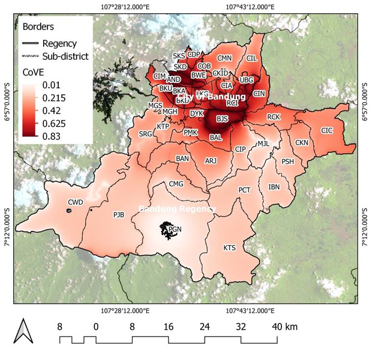 Additionally, this research introduces a new parameter, namely, CoVE. Once the equalizing procedure of the aging structure is applied, the CoVE can be obtained. To compute this ratio, the total population of confirmed case of COVID-19 positive (∑C) and the total elderly (> 65 years) population (∑E) are required (Eq. 1). This formula is utilized as the confirmed case of COVID-19 positive is available in both districts and sub-districts level and has different structures compared to the aging population data provided by the Central Statistics Agency (BPS). As mentioned before, the aging population data at the sub-district level are only available for Bandung City and at the district level in Bandung Regency.