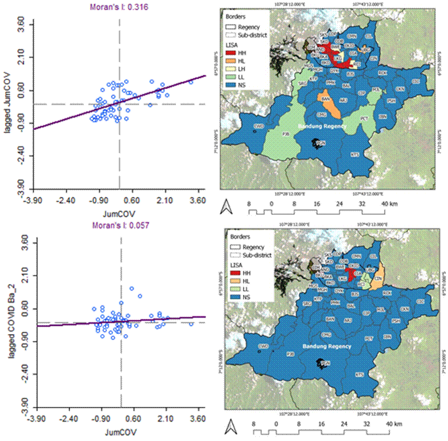 The distribution of confirmed COVID-19 and the CoVE in Bandung Region is evaluated using the spatial autocorrelation based on the global Moran's I, and it is expanded using the local indicator spatial association (LISA). Both are exciting methods to offer a widely usage of application, that calculate the correlation of values in a space and put it into a cluster and non-cluster to assess the spatial pattern of an object. Previously the global Moran's I is proposed by Moran (1950) and LISA is explained by Anselin (1995). Many studies are implemented both concepts to understand the health phenomena, such as analysis of hand, foot, and mouth disease distribution in Shantou (Zhang et al., 2019), community health development (Anuraga & Sulistiyawan, 2017), and poverty in East Java province (Bekti, 2012).