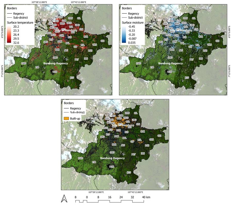 Since the Landsat 8 is already corrected both radiometrically and atmospherically, it is then used to derive the surface moisture information based on the study conducted by McFeeters (2013). The ratio between the corrected green (B2) and near-infrared (B5) bands are employed to compute the normalized difference water index (NDWI) (Eq. 8). Besides that, the same formula by Sobrino et al. (2004) and Weng et al. (2004) is implemented to estimate the surface temperature (LST). Generally, the results depend on the quality of the thermal band (B10) (Eq. 9-11). Both results correspond with the distribution of residential area (built-up) that is obtained through a minimum distance method of supervised classification, with the overall accuracy and the kappa coefficient are 72% and 0.44, respectively. The suggested range for the kappa coefficient group is moderate, for the result of minimum distance method (Richards, 2013).