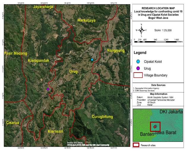 The research is conducted in Urug and Cipatat Kolot Villages, Sukajaya Subdistrict, Bogor Regency, West Java, Indonesia. Various villages border urug village, in the north, urug village borders Harkat Jaya village, in the south by Kiara Sari village and Curug Bitung village, in the east by Nanggung Village and in the west by Cisarua and Pasir Madang village. While Cipatat Kolot societies close to Urug societies in Urug village. The map location of this research can be viewed in Figure 1 below.
