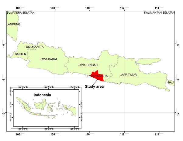 The study was conducted in the Province of the Special Region of Yogyakarta (Figure 1), located on the island of Java, Indonesia, consisting of four districts and one city. Sleman Regency in the north, Kulon Progo Regency in the west, Bantul Regency in the south, Gunungkidul Regency in the east, and Yogyakarta City are located in the center of the province.