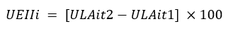 In the current study, the Urban Expansion Intensity Index (UEII) was also used. The researcher can use the UEII to calculate the average annual proportion of newly increased built-up land within a spatial unit, standardised by that spatial unit's total area, as indicated in Equation 5 (Li et al., 2015; Herold et al., 2015). where TLAi is the total area in i unit; ULAit2 and ULAit1 are the areas in i unit at times t2 and t1, respectively; UEIIi is the urban expansion intensity index in i unit; and t is the study period.
