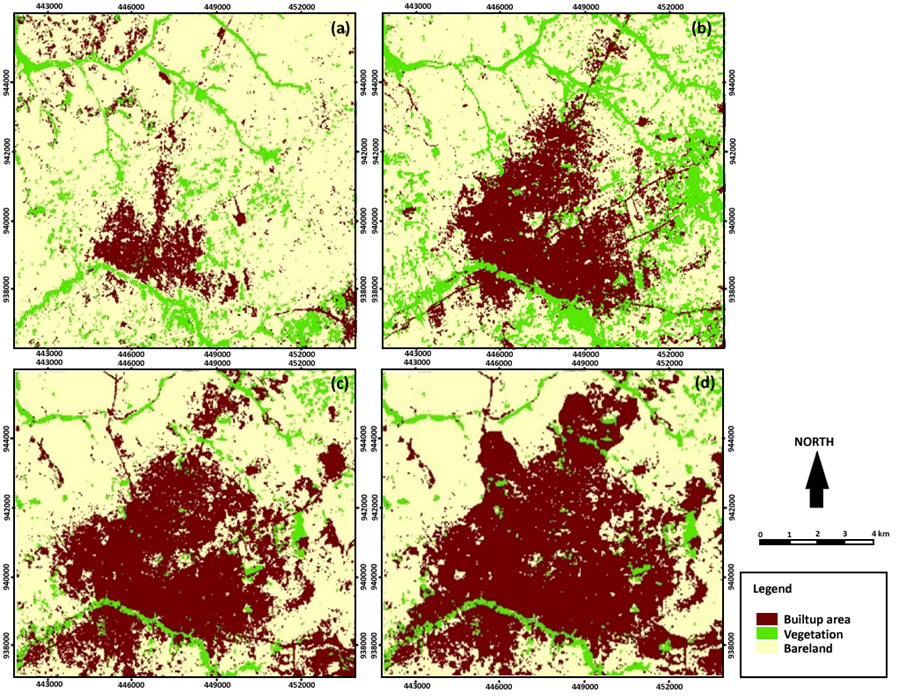 Due to the medium spatial resolution of the Landsat imagery, some land cover types may be contained inside a single pixel. Due to this, it may be challenging to distinguish one particular land cover class using spectral features from other classes (Ji and Jensen, 1999). For operational applications, land cover maps created from satellite images are typically insufficient.SAVI, UI, and MNDWI indexes were used to classify the land cover. The urban cover is divided into four broad categories: developed land, undeveloped land, vegetated land, and water body.
