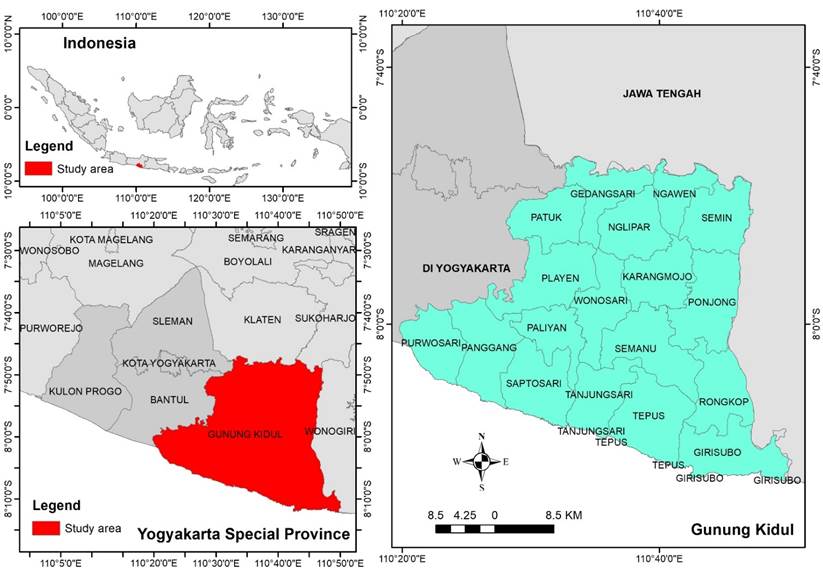 Due to its geography, Gunungkidul Regency is prone to several disasters such as earthquakes, tsunamis, floods, droughts, and landslides (Gunungkidul Regency Regional Regulation No. 22 Concerning Establishment, Organizational Structure, Position and Duties of the Regional Disaster Management Agency, 2011). Disasters that often occur every year in this area are mostly caused by hydrometeorological factors, for example, floods and droughts. It was recorded that 14 districts experienced drought in 2019 (BPBD Gunungkidul, 2019). In addition, there were floods, landslides, and strong winds caused by the Cempaka Tropical Cyclone in 2017. According to data from the Regional Disaster Management Agency (BPBD Gunungkidul, 2017), landslides were recorded at several points in Gedangsari District; flooding was recorded in Nglipar District and several other districts and resulted in many bridges being damaged. Many disaster events occur every year. This fact highlights the importance of preparing hazard maps in Gunungkidul Regency as one of the region’s disaster mitigation efforts.