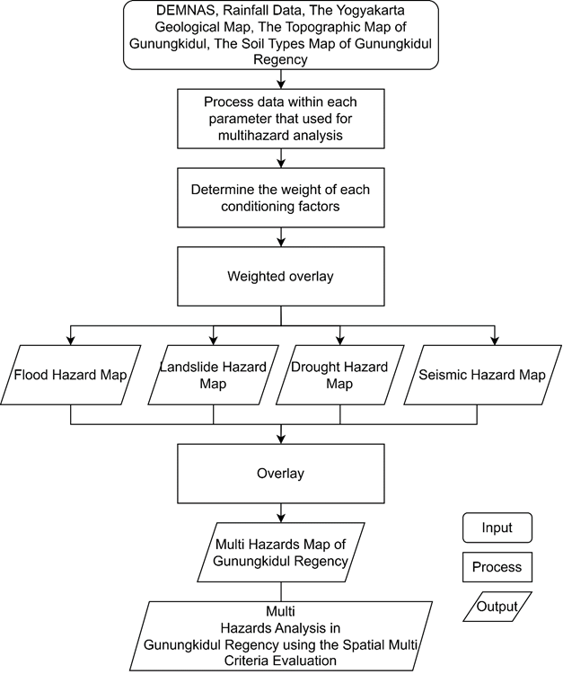 The purpose of the study is to establish a technique for quantitative and descriptive analysis of the multiple hazards that occur in the Gunungkidul Regency using Spatial Multi-Criteria Evaluation (SMCE). This method was originally developed by ITC for ILWIS software. It is used in decision-making processes whose analysis processes consider and evaluate criteria spatially (Rohaendi, 2017). The SMCE method has been widely used for various purposes such as land use evaluation (Rohaendi, 2017), development planning (Marsh et al., 2021), land suitability evaluation (Wahyu et al., 2023).