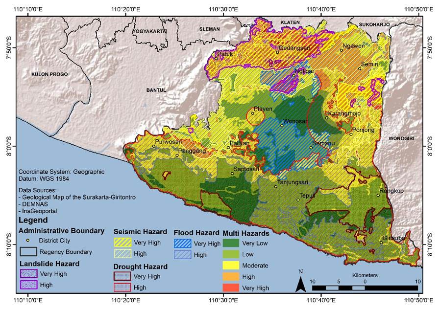 Gunungkidul Regency has a multi-hazard potential consisting of landslides, earthquakes, droughts, and floods. Diverse potential disasters require good mitigation and adaptation planning. Multi-hazard mapping is one of the efforts required to reduce the potential for damage and losses when a disaster occurs, such as loss of life and damage to infrastructure, utilities, and public facilities (Khan et al., 2020 ; Wang et al., 2020). Multi-hazard mapping can show the spatial distribution of several hazards that can have regional interactions. These hazards are also related to the geomorphological conditions and characteristics of the landscape in Gunungkidul Regency.