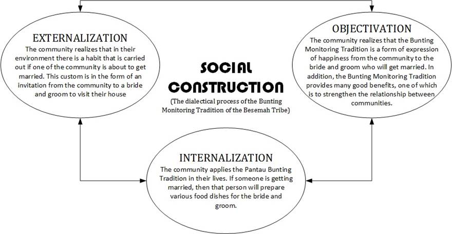 In Social Construction Theory, something can be formed due to the dialectic of externalization (the adjustment of individuals to their environment). This involves objectivity (individuals are aware that they are part of society) and internalization (individuals create a social reality in everyday life) (Susanto et al., 2020). The following is an explanation of the three social processes associated with this Pantauan Bunting Tradition. Based on this explanation of the dialectical process of Pantauan Bunting, the researcher sees it as having component parts as shown in Figure 3.