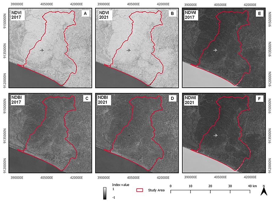 Figure 6.Image Result of The Transformation Indices of (A) NDVI 2017, (B) NDVI 2022, (C) NDBI 2017, (D) NDBI 2021, (E) NDWI 2017, (F) NDWI 2021