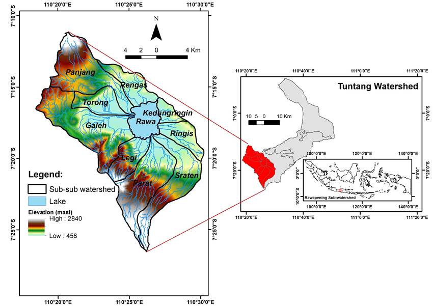 Figure 1. Map of the study area showing the sub-watershed boundary and elevation (Rawapening Sub-watershed).