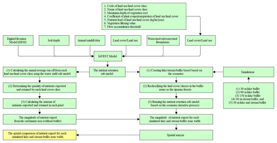 The effect of lake and stream buffer zone widths on total N and P exports was spatially simulated by converting the land cover into riparian forests. Riparian forests in this simulation were assumed to have the same characteristics as forests with the largest nutrient retention ability. The simulation used five scenarios based on buffer zone width, i.e. : (1) 30 m. lake buffer, (2) 90 m. lake buffer, (3) 150 m. lake buffer, (4) 30 m. stream buffer, and (5) 30 m. lake and stream buffer. This study used a 30 m. minimum buffer zone width corresponding to the spatial resolution of SRTM-DEM, i.e., 30 m. The research methodology is shown in Figure 2.