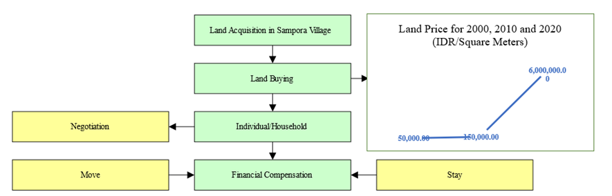 In the gentrification of Sampora Village, land acquisition is carried out by individuals or households. After an agreement on land prices, the residents move out. However, some opted to stay because no agreement was reached or they still had houses. Those who opted to stay had to adapt and cope with the new economic environment—some of the residents who stayed decided to open food stalls or shops.