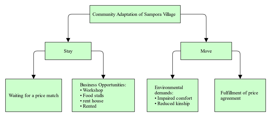 People in the village with economic strength and business opportunities will survive in their villages by opening businesses to keep up with changing conditions that increasingly favor the entry of upper-class people who live or work in Sampora Village. Some people who cannot adapt to the new economic environment will be forced to move out of Sampora Village, while others will choose to move because they strike a deal with property developers. The process of community adaptation is shown in Figure 7.