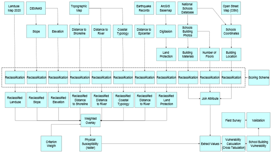 Eight parameters were used to calculate the level of physical susceptibility, whereas three parameters were employed to calculate the vulnerability of the buildings. All parameters were processed using ArcGIS 10.8 with a cell size of 10 m, together with Universal Transverse Mercator projection (Zone 49 S). The results of the overlay analysis were classified using the "Equal Interval" classification method for the reason that the method is commonly applied to divide a range of attribute values into equal-sized sub-ranges automatically. Essentially, the map pertaining to the physical susceptibility and vulnerability of school buildings can be analysed to determine areas that have specific levels of susceptibility and vulnerability. The research flow is described in more detail in Figure 2.