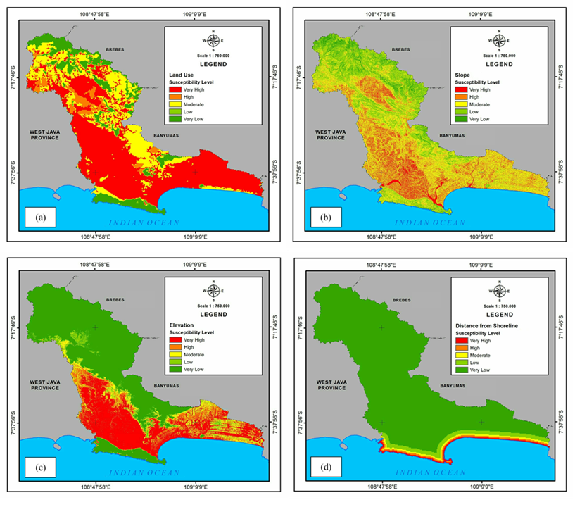 Figure 3.Physical susceptibility level based on (a) land use, (b) slope, (c) elevation, (d) distance from shoreline.