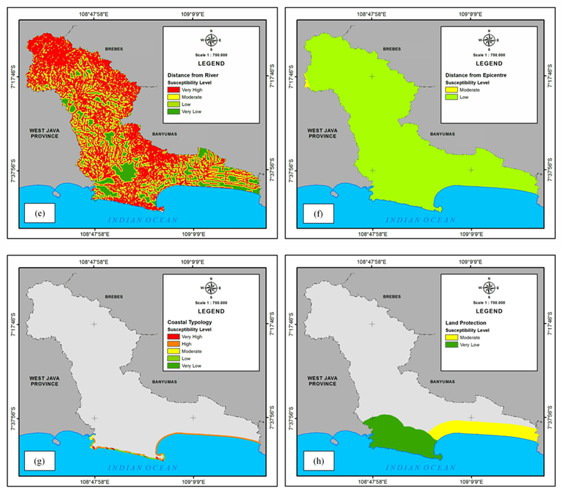 Figure 4.Physical susceptibility level based on (e) distance from river, (f) distance from epicentre, (g) coastal typology, (h) land protection.