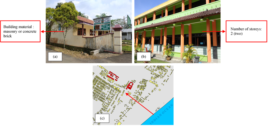 Figure 7.School building in the coastal area of Cilacap region. (a) MA At-Taqwa Nusawungu, (b) SMA Negeri 3 Kroya, (c) building location >6 rows.