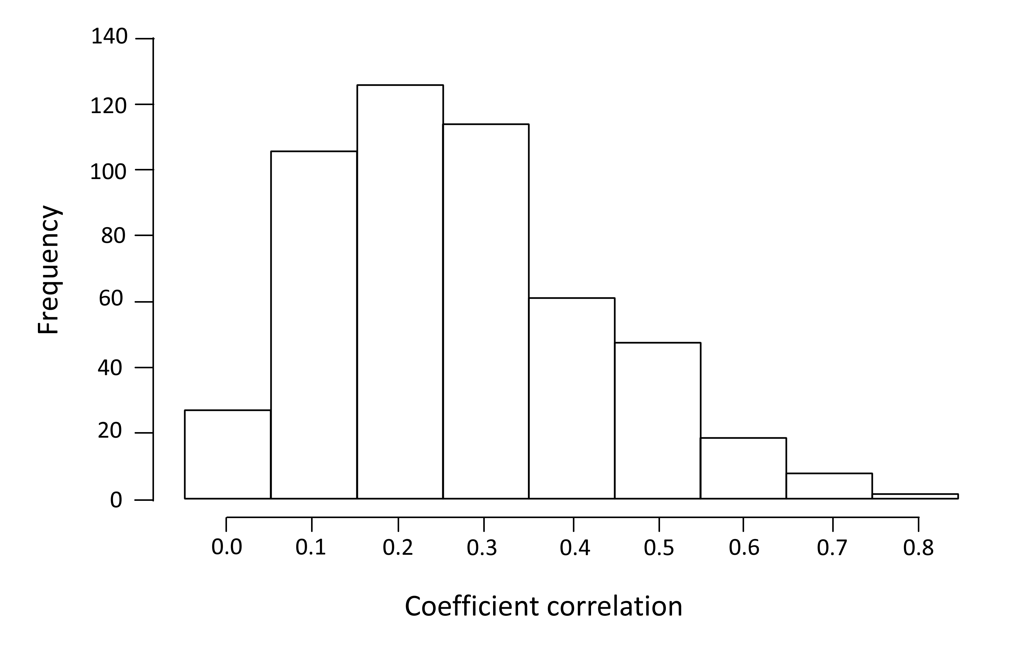 Figure 2. Frequency distribution of daily correlation between TRMM rainfall estimates and observed rain in 2015.