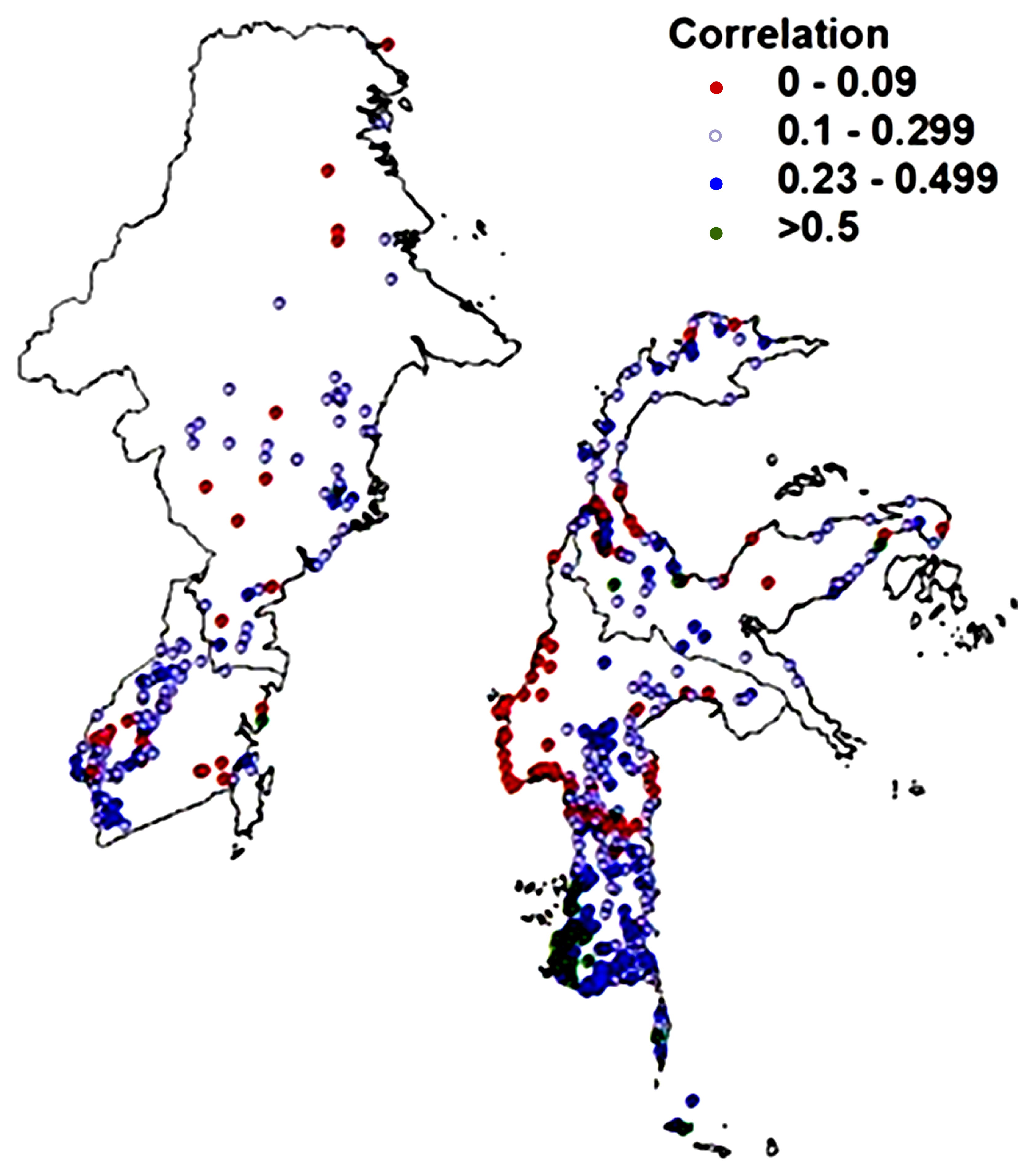 There is a significant difference in the distribution of correlation between the eastern and western part of the region surrounding the Makassar Strait. In some places, there is no correlation between estimation and observation while, in others, there is a strong correlation between them (Figure 3). The correlation distribution is more varied in the east part of the Makassar Strait than in the west part. Commonly, the correlation of Sulawesi Island ranges from no correlation to strong correlation while, on the Kalimantan Island, it ranges from weak correlation to moderate correlation.