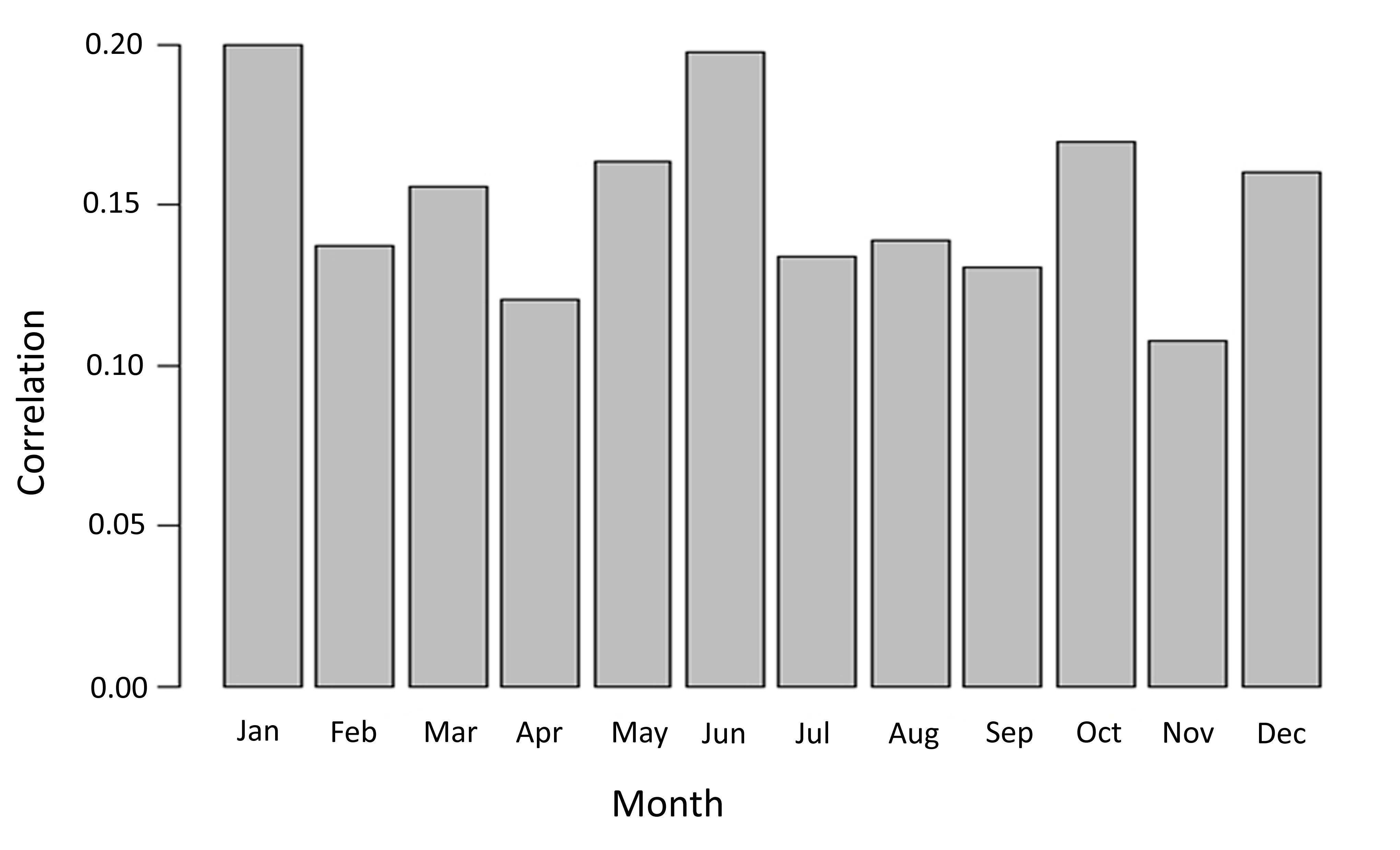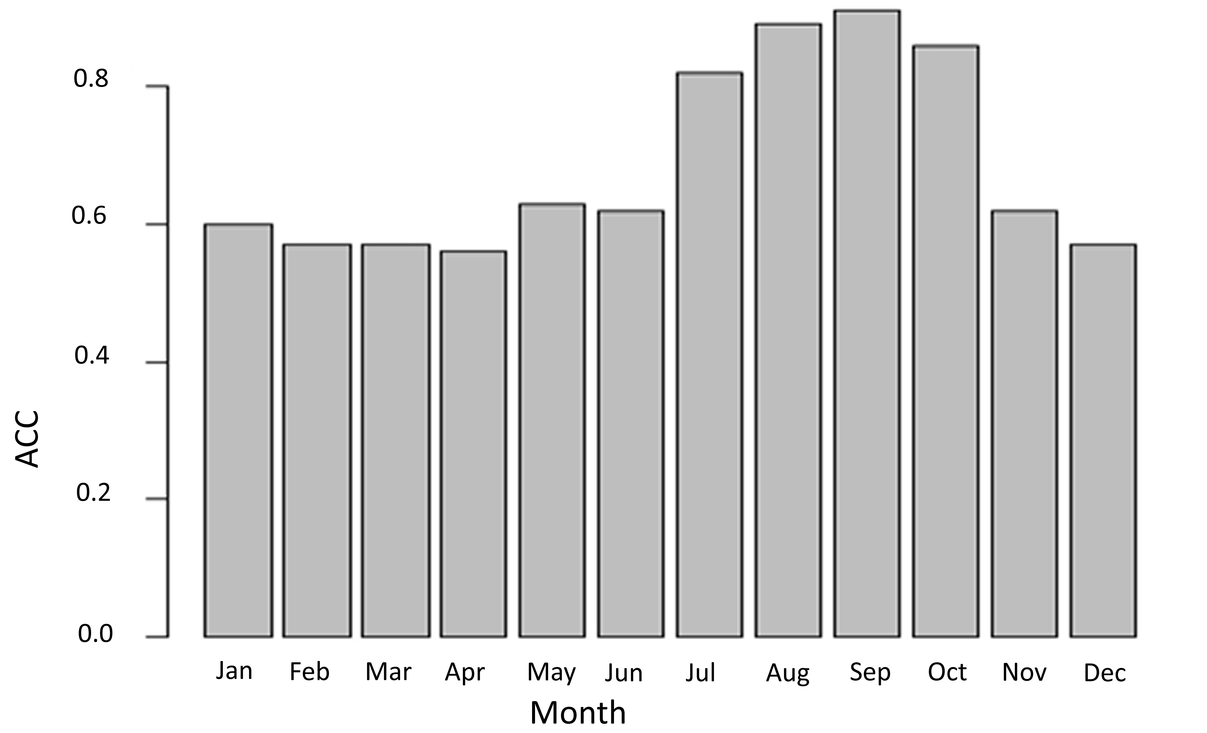 Figure 7. Monthly ACC of TRMM rainfall estimates.