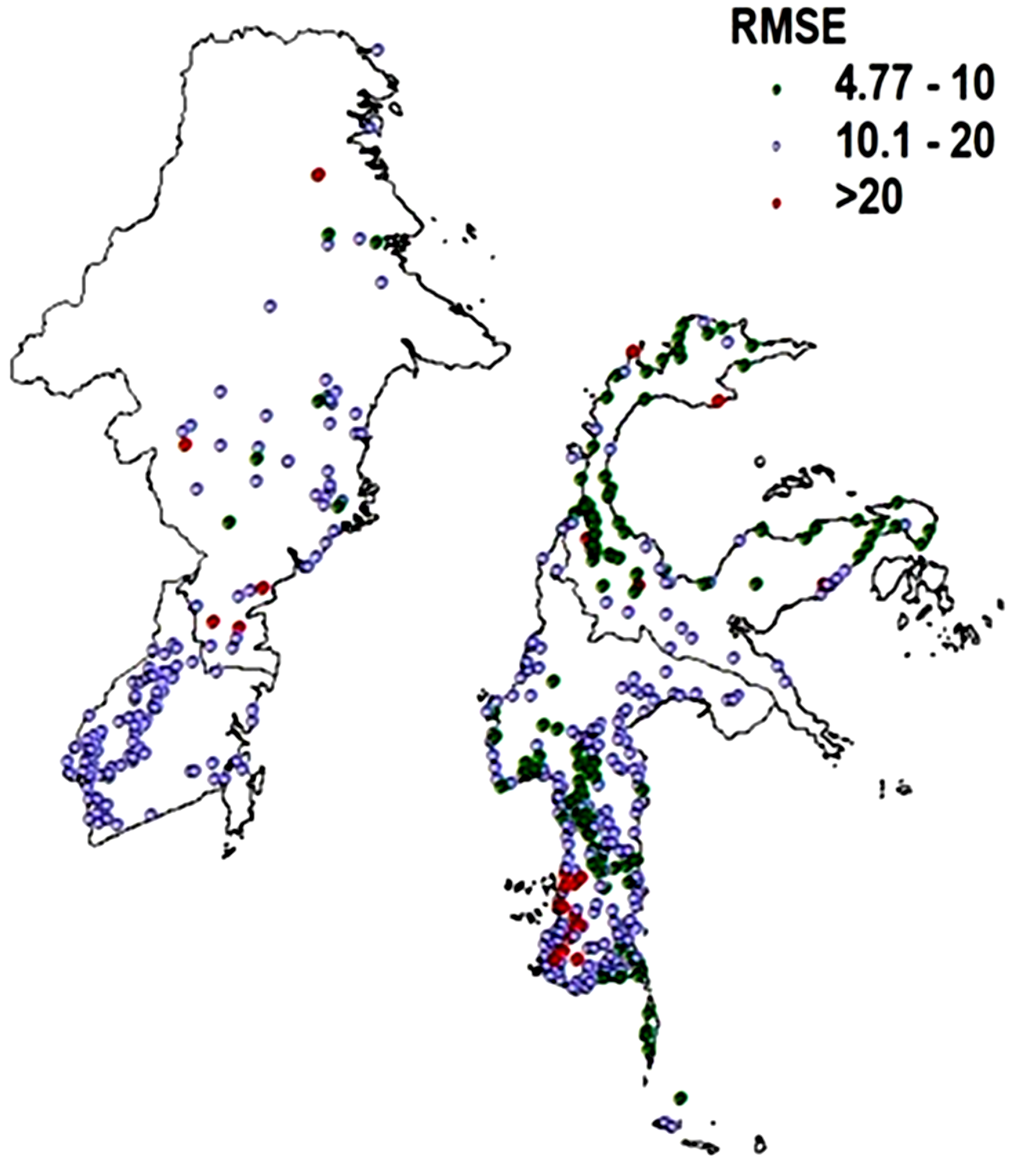 Figure 6 depicts the RMSE’s spatial distribution. Generally, on the Sulawesi Island, RMSE is more varied than on the Kalimantan Island. The details are as follows. First, RMSE distribution on the plain land, such as Kalimantan Island, tends to be similar between 10 – 20 mm. This is no different to the southern part and other parts of Kalimantan. Moreover, the smallest RMSE is found near the equator because, in this region, an equatorial rainfall pattern happens for almost the whole year. Second, in the complex land such as Sulawesi Island, the most RMSE is also 10 – 20 mm. However, the best RMSE or the smallest RMSE is found more in Central and Northern Sulawesi. This is different to Prasetia et al.’s (2013) findings that Palu (Middle Sulawesi) has a higher RMSE than others parts surrounding the Makassar Strait. Moreover, the low RMSE is found in plain land that separates the Southern and Central parts of Sulawesi Island, plain land in Central Equatorial Sulawesi and along the east coast of South Sulawesi.