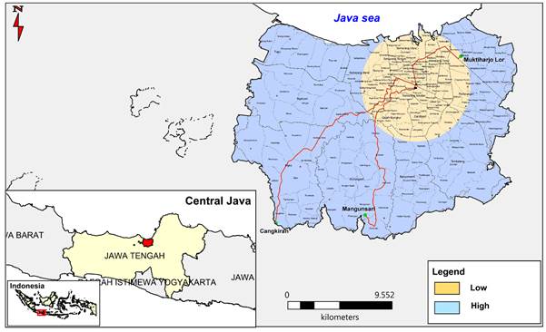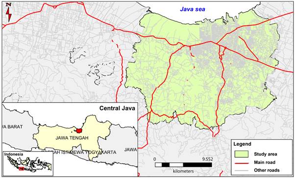 The research was conducted in Semarang City (Figure 1). This city is located in Central Java Province, Indonesia, and it administratively comprises of 16 districts with an area of 382,241 km2. Administratively, the study area is adjacent to Kendal regency in the west, Semarang regency in the south, Demak regency in the east and the Java Sea in the north.