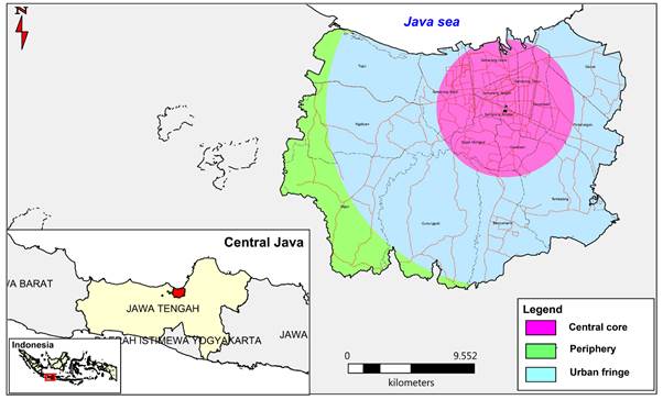 Semarang as the capital of Central Java province is one of the metropolitan cities in Indonesia, with a population of 1.73 million as at 2017, and an increase of nearly 350,000 in 2006 (Semarang Central Bureau of Statistics, 2017). It is also the centre of the National Strategic Area of Kedungsepur (Kendal, Demak, Ungaran, Salatiga, Semarang and Purwodadi). It is estimated that one-third of the Kedungsepur population lives in Semarang City. The built-up area of the city consequently grew up by 961.17 ha between 2006 and 2012 (Nahib, 2016). The residents preferring suburban areas is attributable to the higher activities in the urban areas. This has been established with the rate of negative population growth of 5% - 21% in the city centre area.